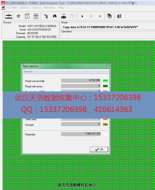 解决方案:收到硬盘后,从我们的备件库找到匹配的备件,在无尘柜里面更换磁头,再接到数据恢复工具PC-3000 UDMA Express上,通电硬盘认盘,镜像,成功恢复客户酒店管理系统的数据库文件!