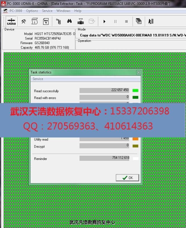 注:由于涉及隐私数据,客户要求当面恢复数据,我们收到硬盘后,直接在无尘柜里面更换匹配的磁头,接到PC3000