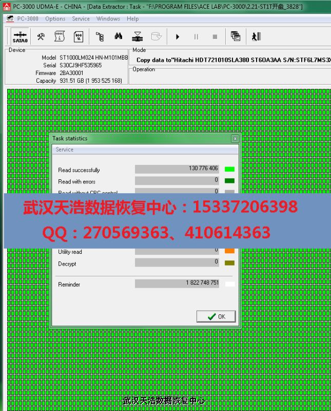 解决方案:收到硬盘后,从我们的备件库找到匹配的备件,在无尘柜里面更换磁头,再接到数据恢复工具PC-3000 UDMA Express上,通电硬盘认盘,镜像,成功恢复恢复客户的几乎全部数据!