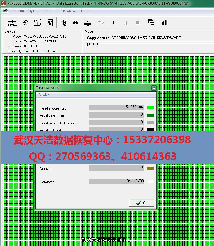 解决方案:收到硬盘后,从我们的备件库找到匹配的备件,在无尘柜里面更换磁头,再接到数据恢复工具PC-3000 UDMA Express上,通电硬盘认盘,镜像,成功恢复客户的几乎全部数据!