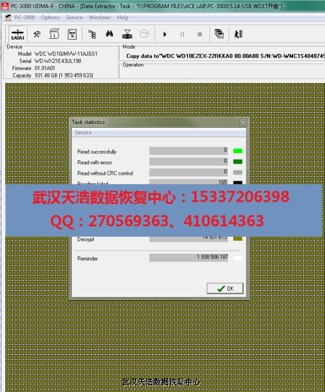 解决方案:收到硬盘后,从我们的备件库找到匹配的备件,在无尘柜里面更换磁头,再接到数据恢复工具PC-3000 UDMA Express上,通电硬盘认盘,查看数据区发现数据区加密,通过DE解密,镜像,成功恢复客户的大部分工作资料和各地旅游照片!