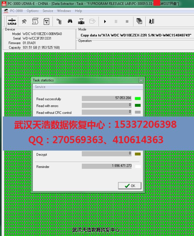 解决方案:收到硬盘后,从我们的备件库找到匹配的备件,在无尘柜里面更换磁头,再接到数据恢复工具PC-3000 UDMA Express上,通电硬盘认盘,分区正常显示,数据目录全部正常展开,镜像,成功恢复客户的几乎全部数据!