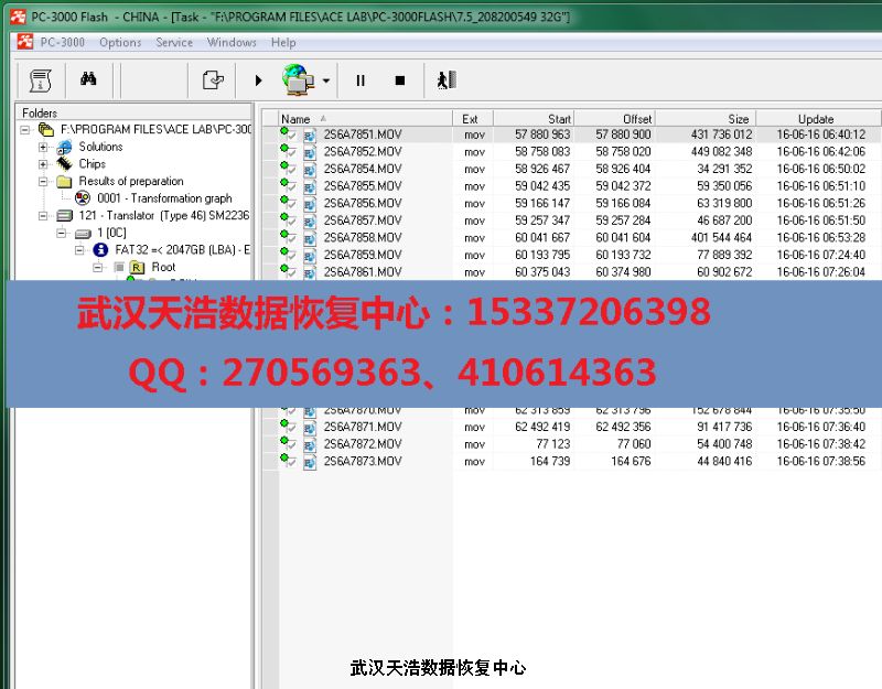 解决方案:接到CF卡后,用设备取下BGA FLASH芯片,使用专业的FLASH恢复工具PC3000 Flash,更换对应的BGA52的座子,读取,再分析重组,成功恢复客户CF卡内的大多数视频。