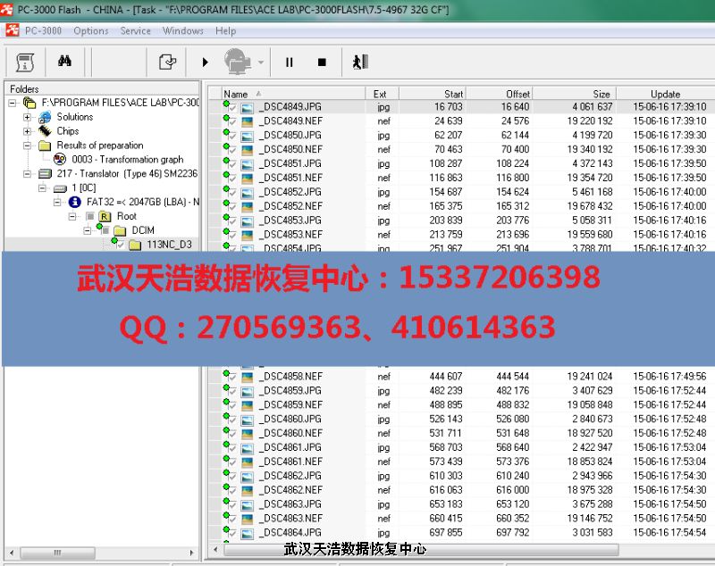 解决方案:接到CF卡后,用设备取下BGA FLASH芯片,使用专业的FLASH恢复工具PC3000 Flash,更换对应的BGA152的座子,读取,再分析重组,成功恢复客户CF卡内的几乎所有高清照片。