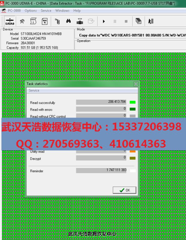 解决方案:收到硬盘后,从我们的备件库找到匹配的备件,在无尘柜里面更换磁头,再接到数据恢复工具PC-3000 UDMA Express上,通电硬盘认盘,镜像,成功恢复客户的几乎全部数据!