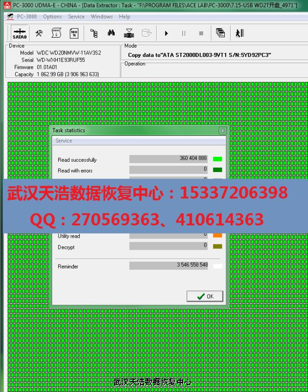解决方案:收到硬盘后,从我们的备件库找到匹配的备件,在无尘柜里面更换磁头,再接到数据恢复工具PC-3000 UDMA Express上,通电硬盘认盘,分区正常显示,数据目录全部正常展开,镜像,成功恢复客户公司的几乎全部资料!