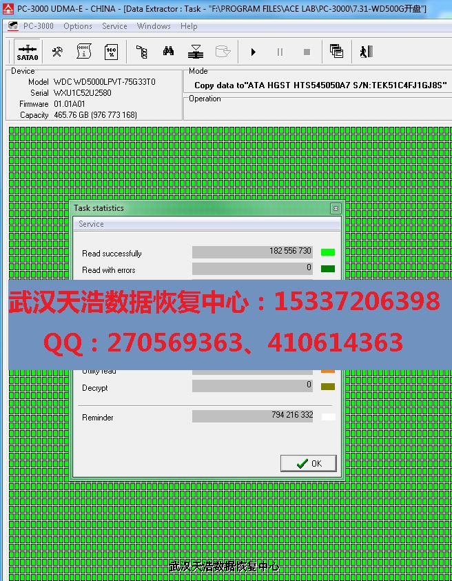 解决方案:收到硬盘后,从我们的备件库找到匹配的备件,在无尘柜里面更换磁头,再接到数据恢复工具PC-3000 UDMA Express上,通电硬盘认盘,分区正常显示,数据目录全部正常展开,镜像,成功恢复客户几乎全部的文档和照片类数据!