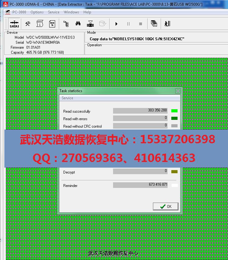 解决方案:收到硬盘后,从我们的备件库找到匹配的备件,在无尘柜里面更换磁头,再接到数据恢复工具PC-3000 UDMA Express上,通电硬盘不认盘,处理固件后,硬盘正常认盘,建DE镜像任务,分区正常显示,数据目录全部正常展开,镜像,成功恢复客户的几科全部数据!