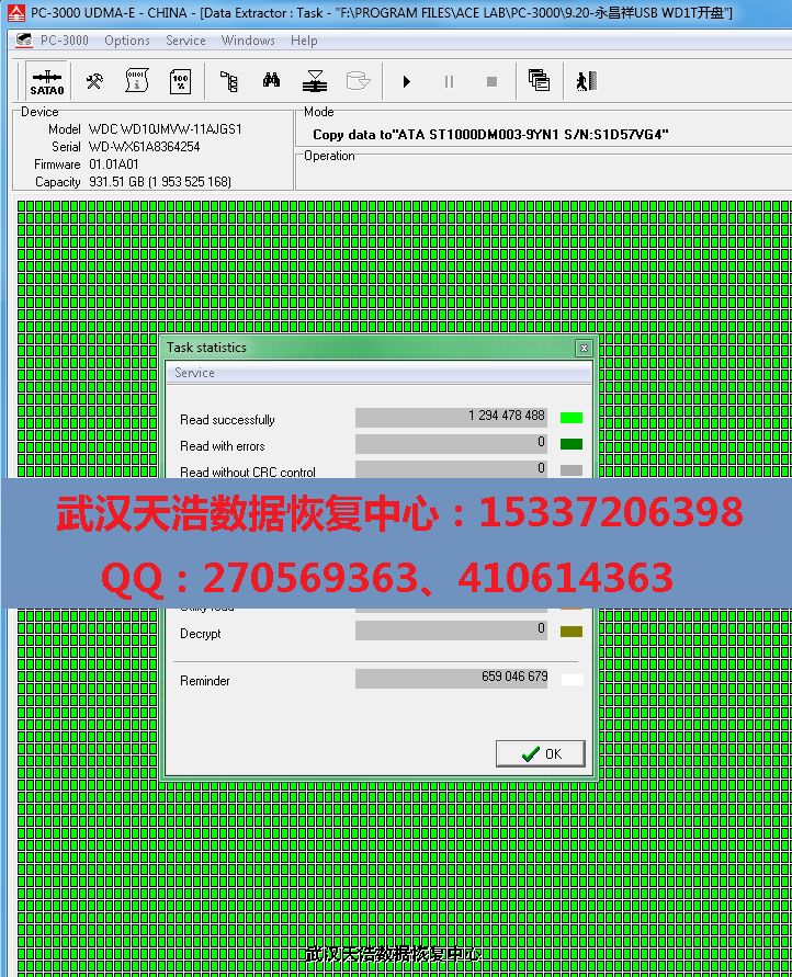 解决方案:收到硬盘后,从我们的备件库找到匹配的备件,在无尘柜里面更换磁头,再接到数据恢复工具PC-3000 UDMA Express上,通电硬盘认盘,镜像,成功恢复客户单位的几乎全部工作资料!
