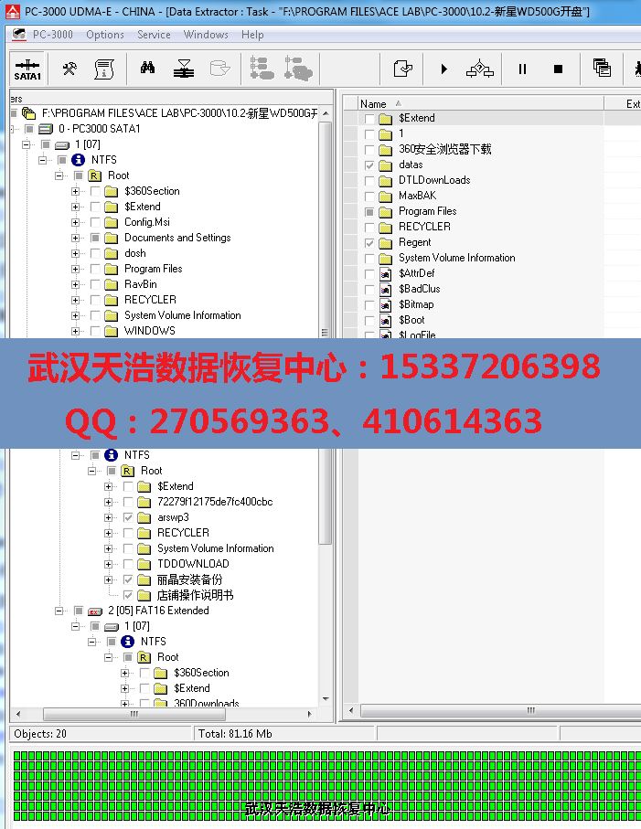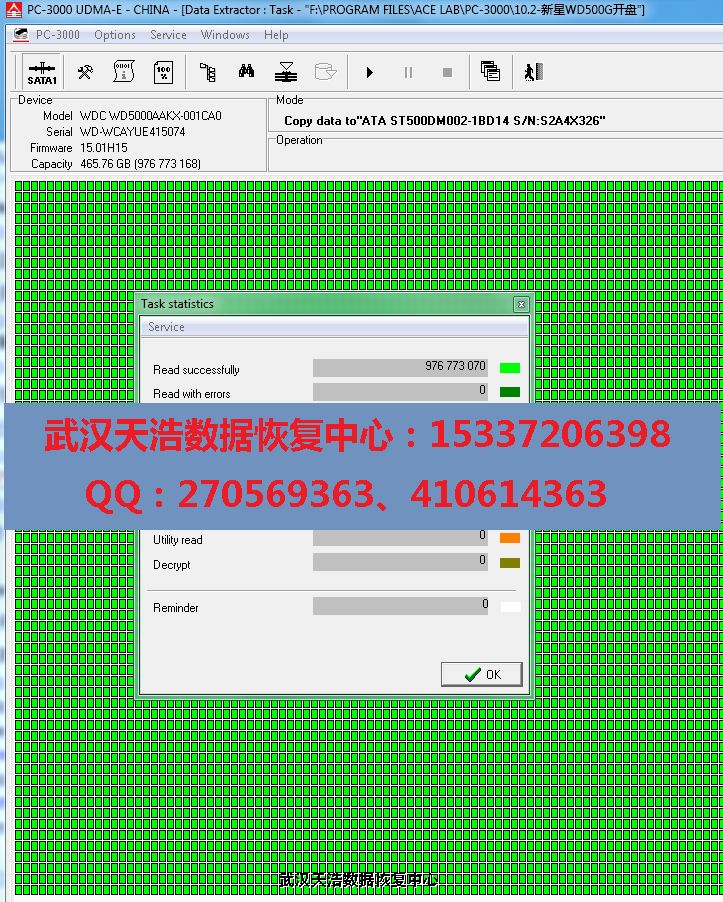 解决方案:收到硬盘后,从我们的备件库找到匹配的备件,在无尘柜里面更换磁头,再接到数据恢复工具PC-3000 UDMA Express上,通电硬盘认盘,镜像,成功恢复客户单位的几乎全部工作资料!包括客户单位的财务数据库,经验证完整恢复!