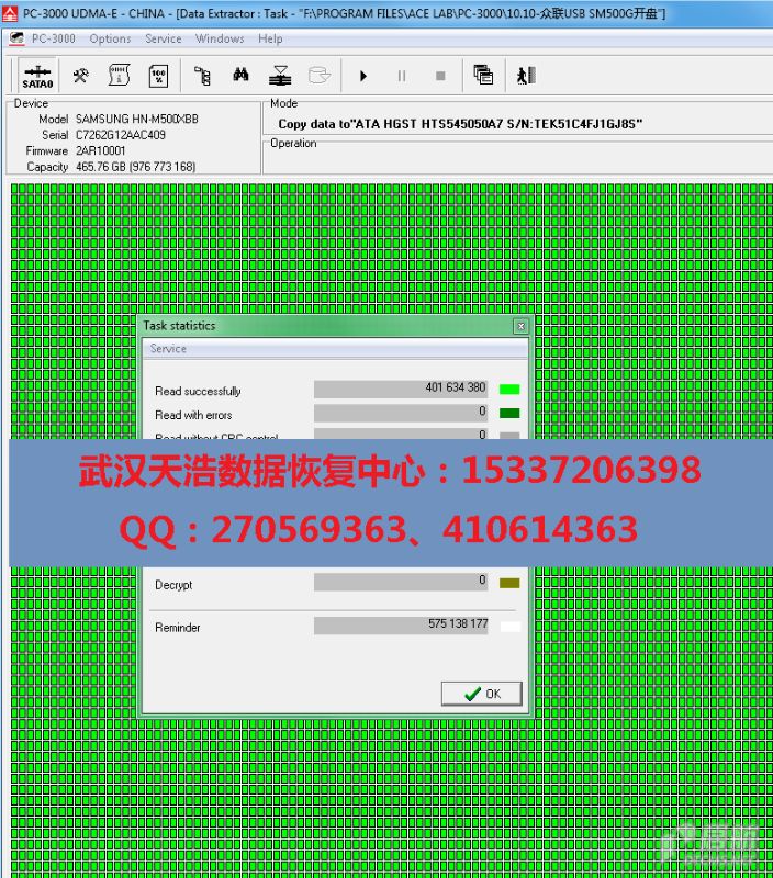 解决方案:收到硬盘后,从我们的备件库找到匹配的备件,在无尘柜里面更换磁头,然后再接到数据恢复工具PC-3000 UDMA Express上,通电硬盘认盘,镜像,成功恢复客户单位的几乎全部数据!