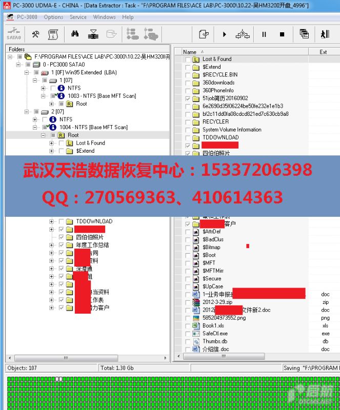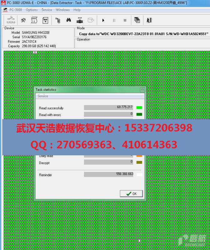解决方案:收到硬盘后,从我们的备件库找到匹配的备件,在无尘柜里面更换磁头,再接到数据恢复工具PC-3000 UDMA Express上,通电硬盘认盘,DE分头镜像,成功恢复客户的几乎全部工作和个人资料!
