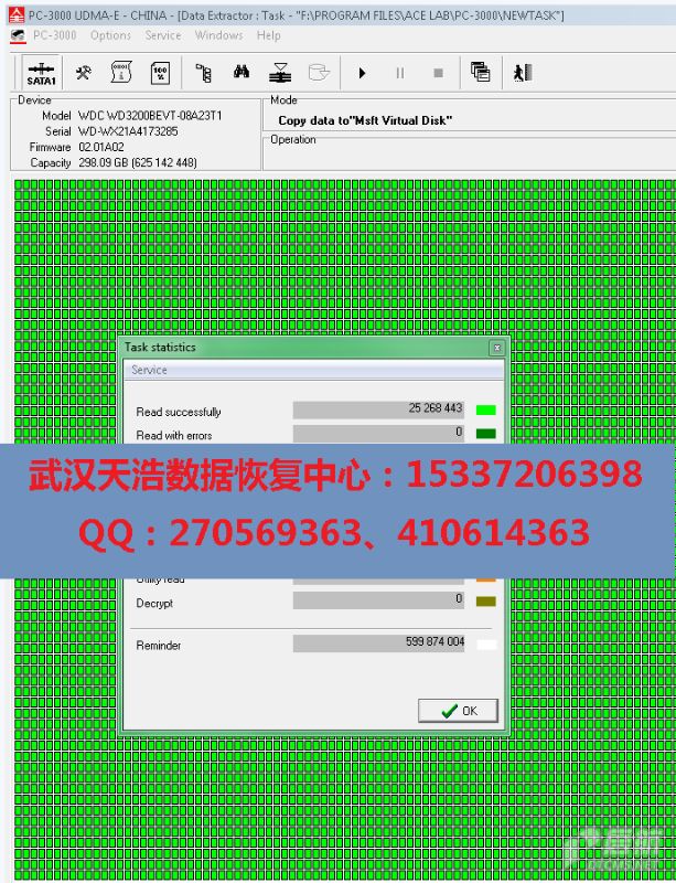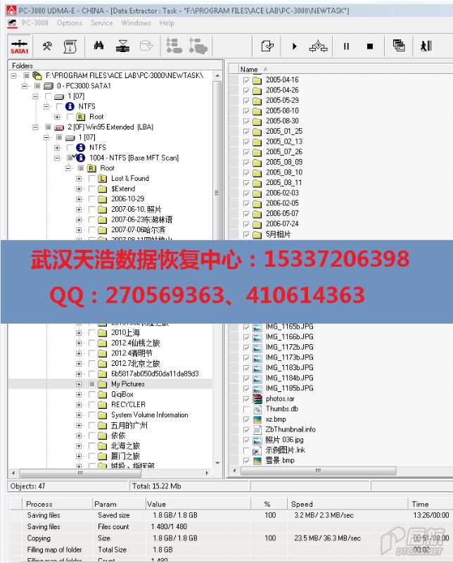 解决方案:收到硬盘后,从我们的备件库找到匹配的备件,在无尘柜里面更换磁头,再接到数据恢复工具PC-3000 UDMA Express上,通电硬盘不认盘,处理固件后,硬盘正常认盘,建DE镜像任务,分区正常显示,数据目录全部正常展开,镜像,成功恢复客户的几乎全部工作资料和各地旅游的照片!