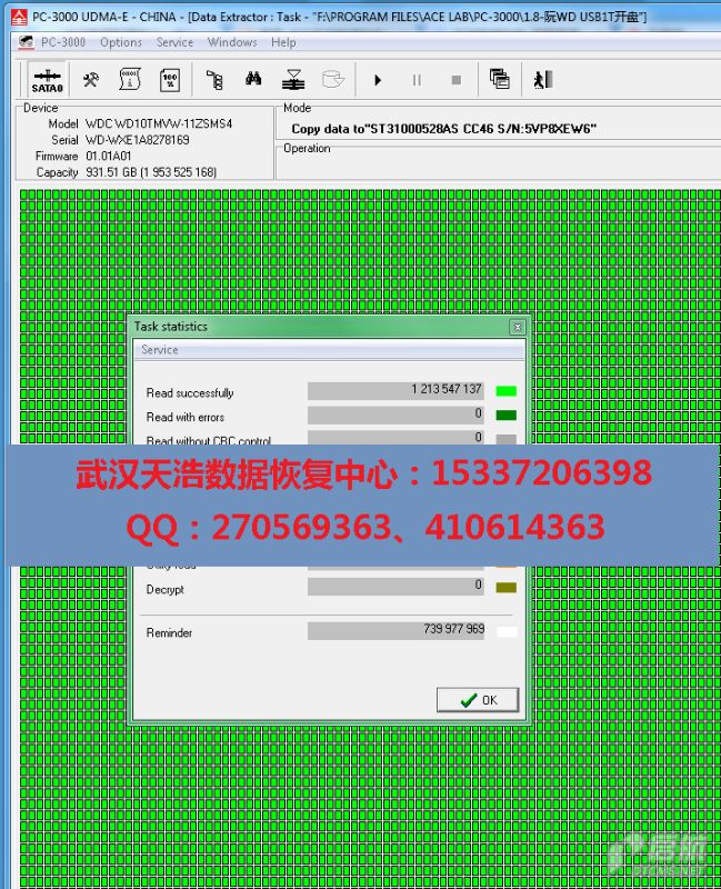 解决方案:收到硬盘后,我们在无尘柜里面更换兼容的磁头,然后换匹配的SATA电路板,再接到数据恢复工具PC-3000 UDMA Express上,硬盘通电认盘,数据区可以正常访问。镜像成功恢复客户的大部分资料!