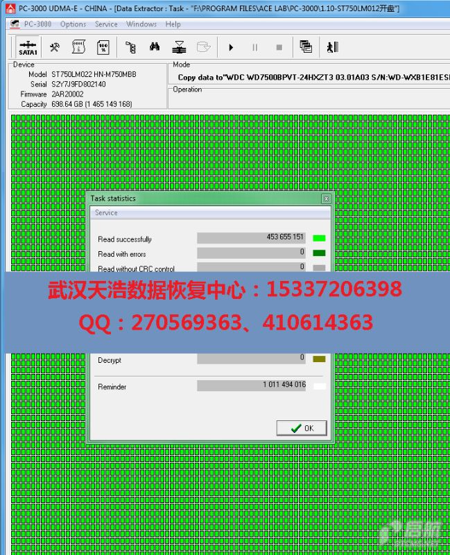 解决方案:收到硬盘后,从我们的备件库找到匹配的备件,在无尘柜里面更换磁头,再接到数据恢复工具PC-3000 UDMA Express上,通电硬盘认盘,DE分头,再镜像,成功恢复客户的几乎全部数据!