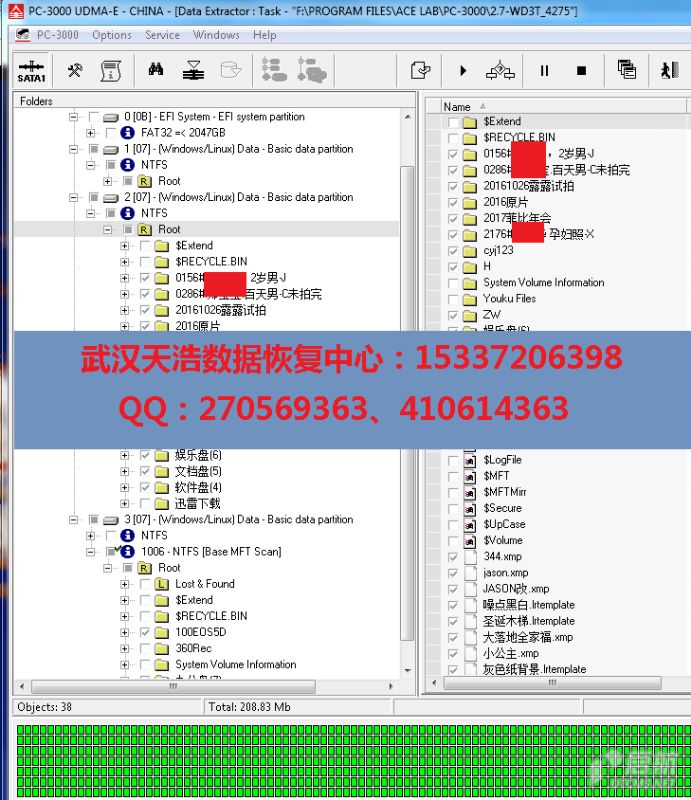 解决方案:收到硬盘后,从我们的备件库找到匹配的备件,在无尘柜里面更换磁头,再接到数据恢复工具PC-3000 UDMA Express上,通电硬盘认盘,DE分头镜像,成功恢复客户的绝大部分数据!
