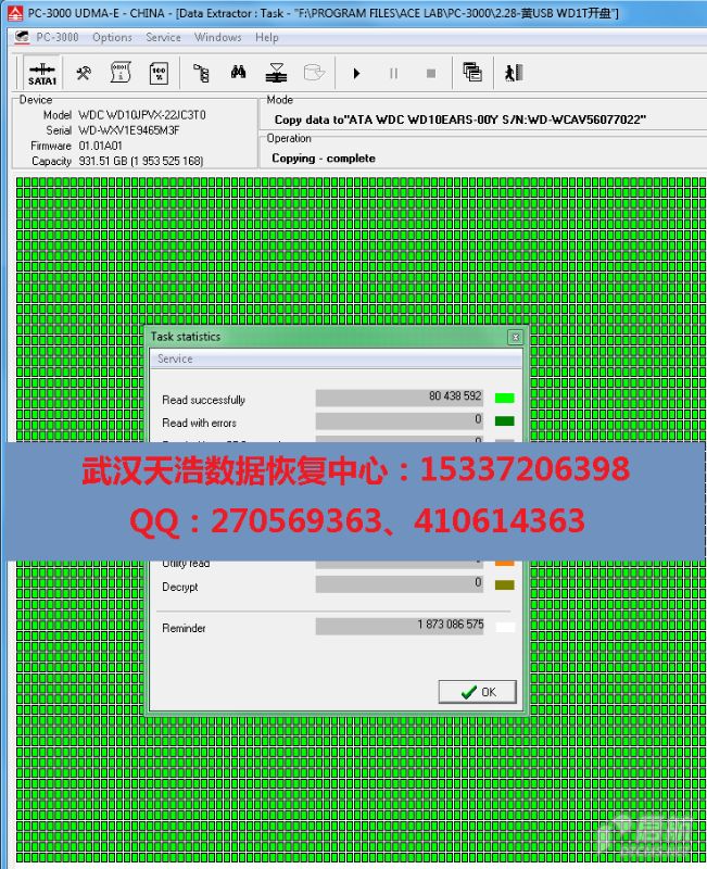 解决方案:收到硬盘后,从我们的备件库找到匹配的备件,在无尘柜里面更换磁头,再接到数据恢复工具PC-3000 UDMA Express上,通电硬盘认盘,镜像,成功恢复客户几乎全部数据!