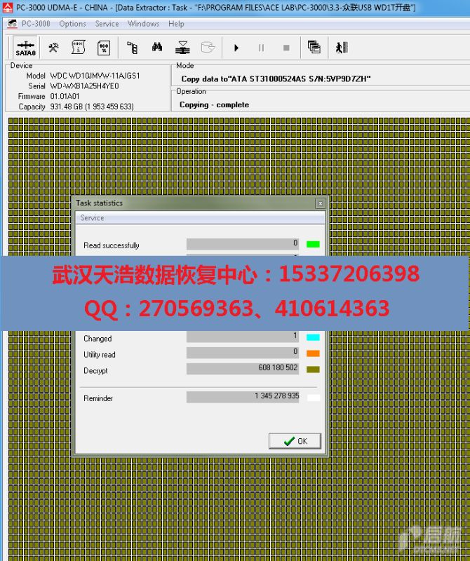 解决方案:收到硬盘后,从我们的备件库找到匹配的备件,在无尘柜里面更换磁头,更换兼容的SATA电路板,再接到数据恢复工具PC3000 UDMA Express上,通电硬盘认盘,检测数据区发现有加密,使用PC3000 UDMA的解密功能,数据区正常,镜像,盘片有点划伤,最后成功恢复客户大部分数据!
