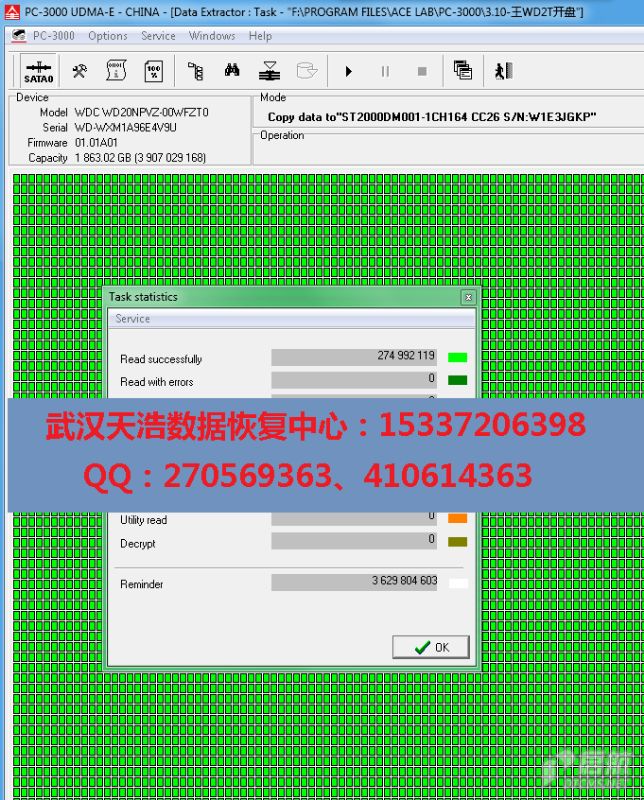 解决方案:收到硬盘后,从我们的备件库找到匹配的备件,在无尘柜里面更换磁头,更换兼容的SATA电路板后,再接到数据恢复工具PC-3000 UDMA Express上,通电硬盘认盘,镜像,成功恢复客户大部分数据!