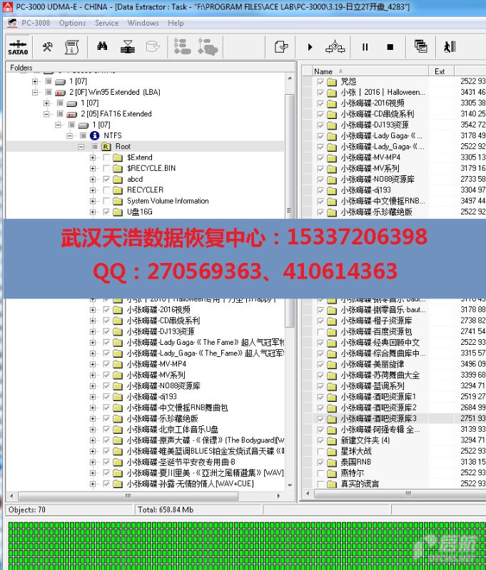 故障现象:硬盘不小心掉到地上,再通电异响,客户是DJ,里面全是平时用的音乐,硬盘损坏工作都受影响,要求我们尽快帮忙恢复。