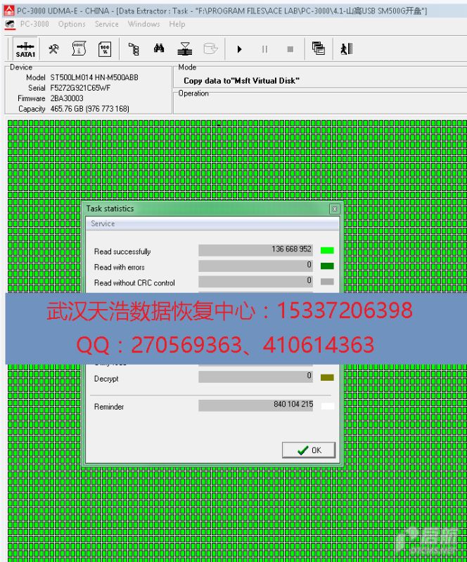 解决方案:收到硬盘后,从我们的备件库找到匹配的备件,在无尘柜里面更换磁头,再接到数据恢复工具PC-3000 UDMA Express上,通电硬盘认盘,DE分头,再镜像,成功恢复客户的几乎全部数据!