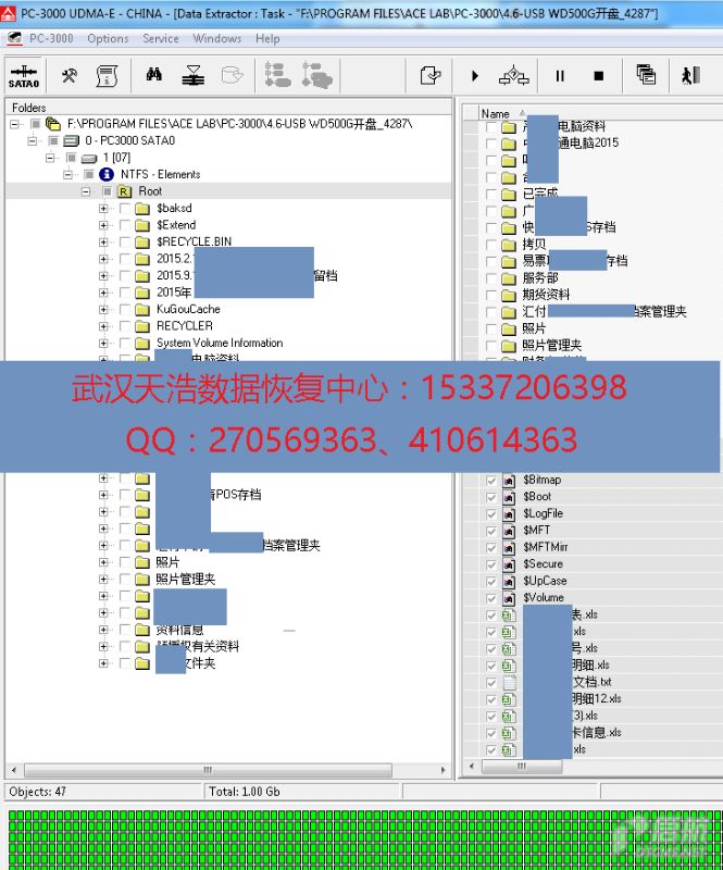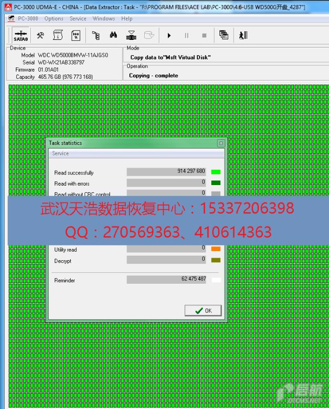 解决方案:收到硬盘后,从我们的备件库找到匹配的备件,在无尘柜里面更换磁头,更换兼容的SATA电路板后,再接到数据恢复工具PC-3000 UDMA Express上,通电硬盘认盘,镜像,成功恢复客户的几乎全部数据!