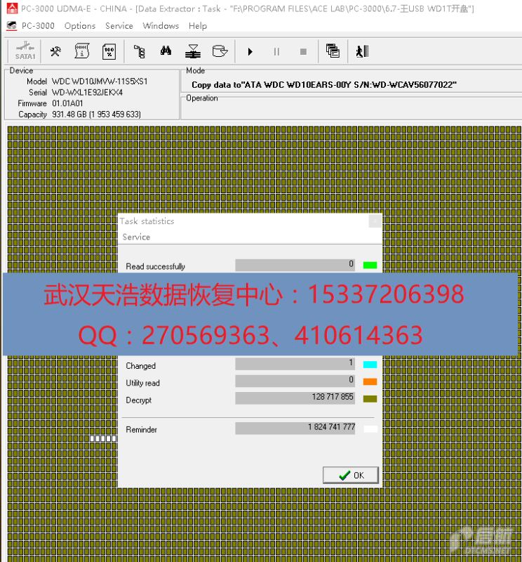 解决方案:收到硬盘后,从我们的备件库找到匹配的备件,在无尘柜里面拆开,更换磁头,再接到数据恢复工具PC-3000 UDMA Express上,通电硬盘认盘,镜像,成功恢复客户的几乎全部数据!