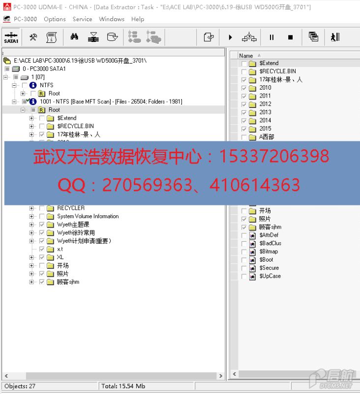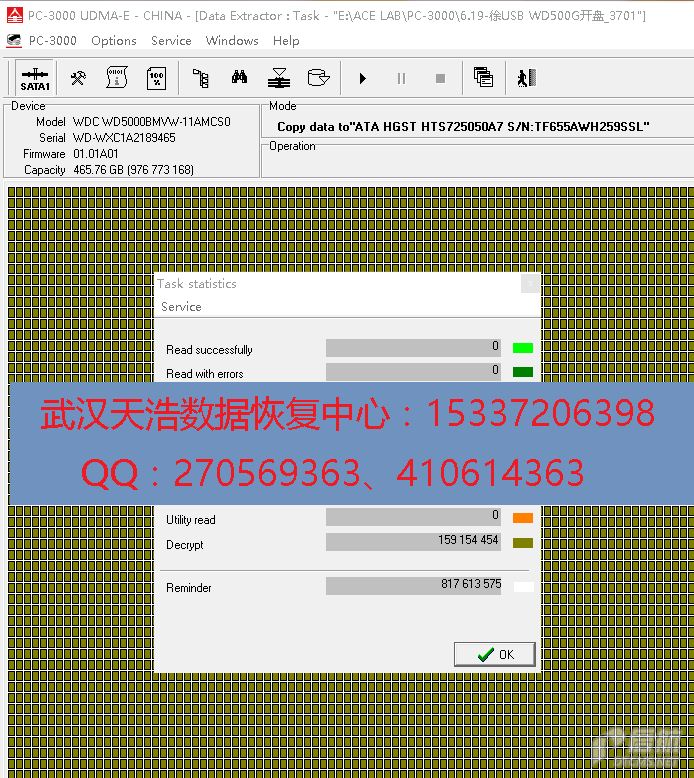 解决方案:收到硬盘后,从我们的备件库找到匹配的备件,在无尘柜里面更换磁头,更换兼容的SATA电路板后,再接到数据恢复工具PC-3000 UDMA Express上,通电硬盘认盘,DE解密镜像,成功恢复客户的几乎全部数据!