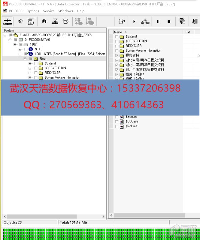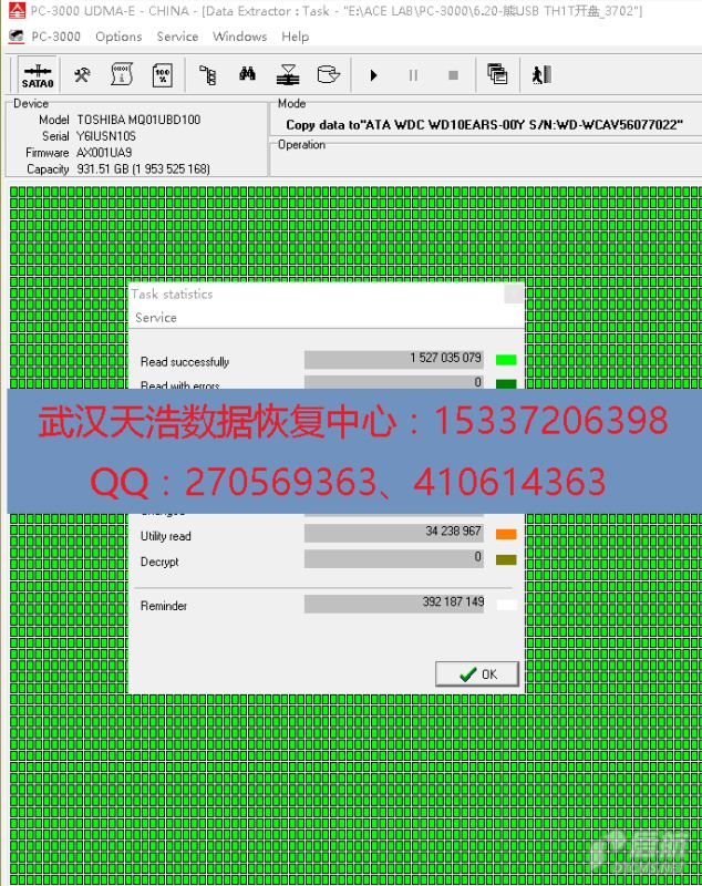 解决方案:收到硬盘后,从我们的备件库找到匹配的备件,在无尘柜里面更换磁头,然后更换兼容的SATA电路板,再接到数据恢复工具PC-3000 UDMA Express上,通电硬盘认盘,DE分头镜像,成功恢复客户的几乎全部数据!