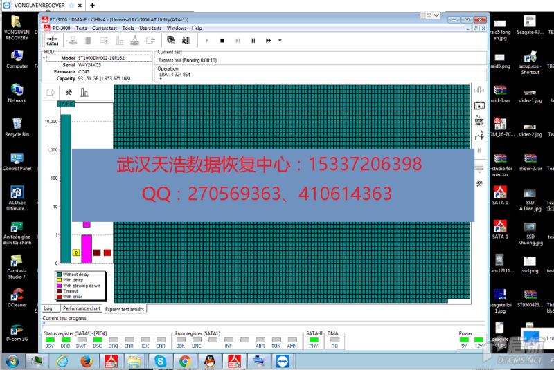 解决方案:通过远程控制软件TeamViewer连到客户的电脑,让客户把硬盘接到数据恢复工具PC-3000 UDMA Express上,通电检测发现,终端信息如下: