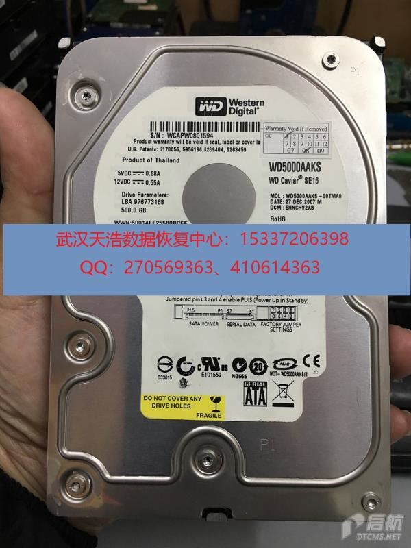 硬盘型号:WD5000AAKS-00TMA0 SN:WCAPW0801594 FW:110090 电路板号:771477-001