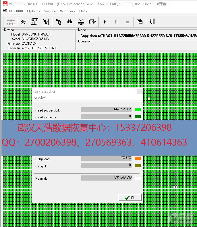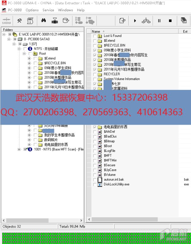 解决方案:收到硬盘后,我们更换兼容的电路板,在无尘环境更换兼容的磁头,再接到数据恢复工具PC-3000 UDMA Express上,通电硬盘认盘,DE分头镜像,镜像,成功恢复客户的几乎全部数据!