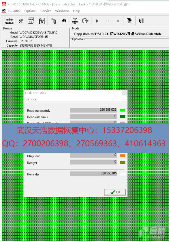 解决方案:收到硬盘后,从我们的备件库找到匹配的备件,在无尘柜里面更换磁头,再接到数据恢复工具PC-3000 UDMA Express上,通电硬盘认盘,DE镜像,成功恢复客户的几乎全部数据!