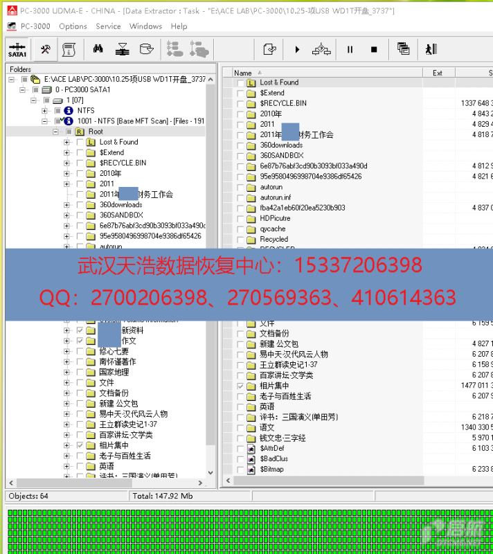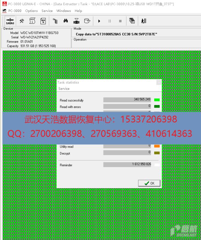 解决方案:收到硬盘后,从我们的备件库找到匹配的备件,在无尘柜里面更换磁头,更换兼容的SATA电路板后,再接到数据恢复工具PC-3000 UDMA Express上,通电硬盘认盘,DE镜像,成功恢复客户的几乎全部数据!