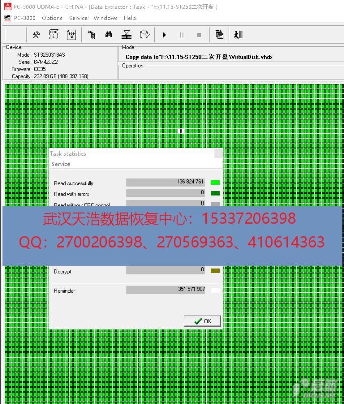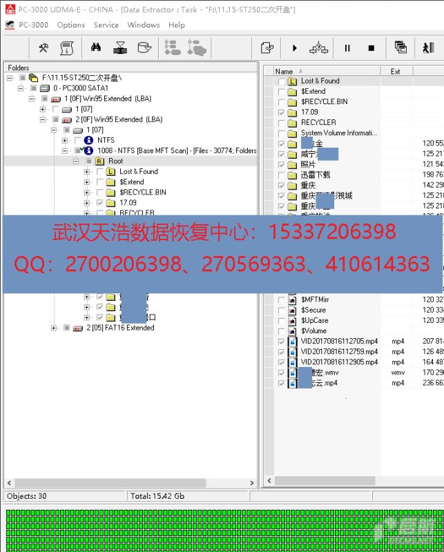 解决方案:收到硬盘后,我们在无尘环境打开,检测发现盘片有轻微划伤,更换兼容的磁头,再通过特殊的方法处理后,接到数据恢复工具PC-3000 UDMA Express上,通电硬盘认盘,DE分头镜像,成功恢复客户的绝大部分视频数据!