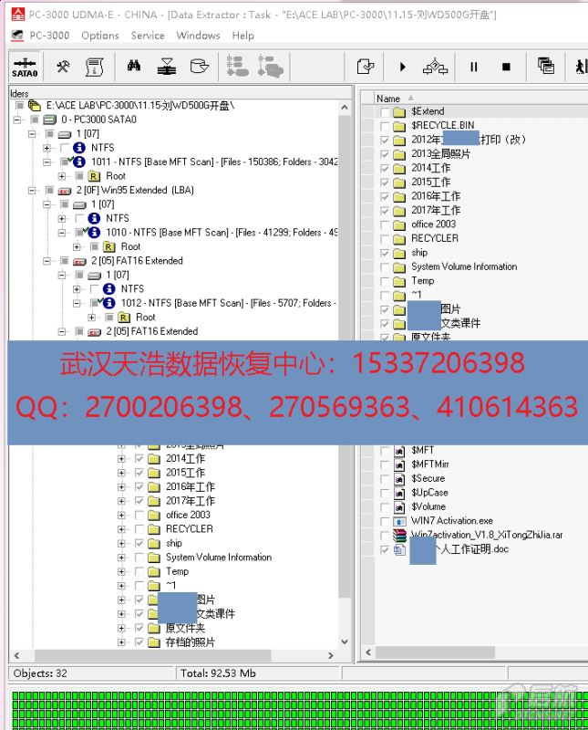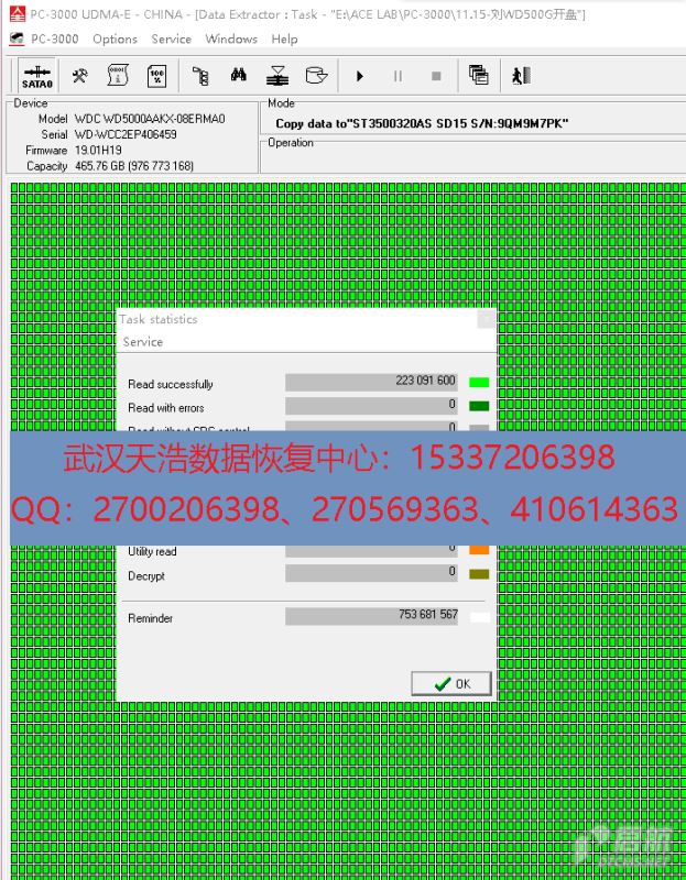 解决方案:收到硬盘后,从我们的备件库找到匹配的备件,在无尘柜里面更换磁头,再接到数据恢复工具PC-3000 UDMA Express上,通电硬盘认盘,DE镜像,成功恢复客户公司的几乎全部数据!