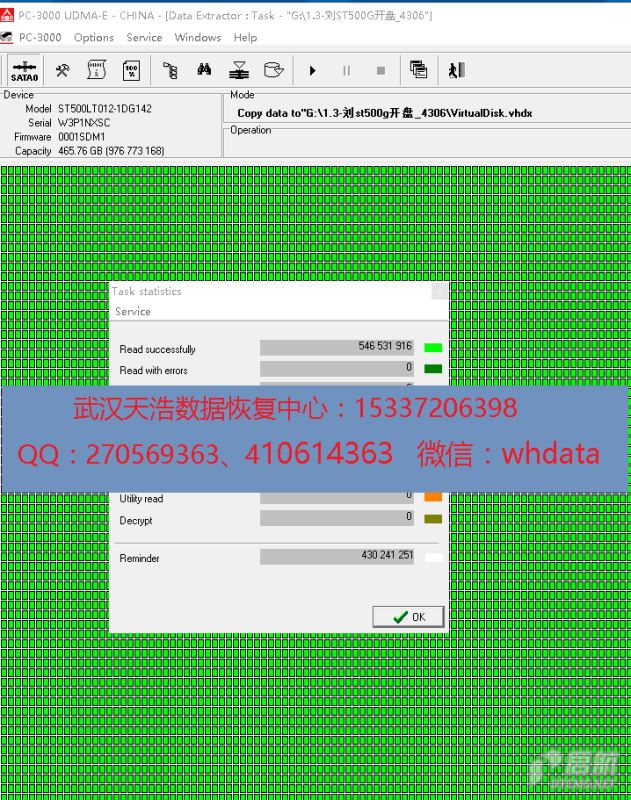 解决方案:收到硬盘后,我们在无尘环境打开,更换兼容的磁头,接到数据恢复工具PC-3000 UDMA Express上,通电硬盘认盘,DE分头镜像,成功恢复客户硬盘里面的大部分数据!