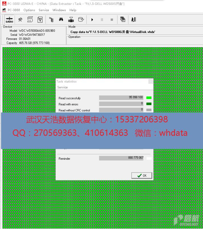解决方案:收到硬盘后,从我们的备件库找到匹配的备件,在无尘柜里面更换磁头,再接到数据恢复工具PC-3000 UDMA Express上,通电硬盘认盘,DE镜像,成功恢复硬盘里面客户公司的几乎全部资料。