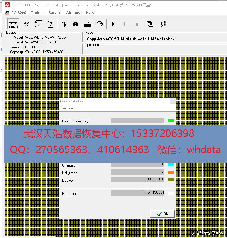 解决方案:收到硬盘后,从我们的备件库找到匹配的备件,在无尘柜里面更换磁头,更换兼容的SATA电路板后,再接到数据恢复工具PC-3000 UDMA Express上,通电硬盘认盘,解密镜像,成功恢复客户的大部分工作资料!