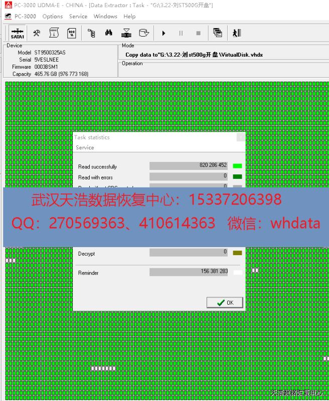 解决方案:收到硬盘后,拆开盒子,我们在无尘环境打开硬盘,更换兼容的磁头,接到数据恢复工具PC-3000 UDMA Express上,通电硬盘认盘,DE分头镜像,成功恢复客户硬盘里面的大部分数据!