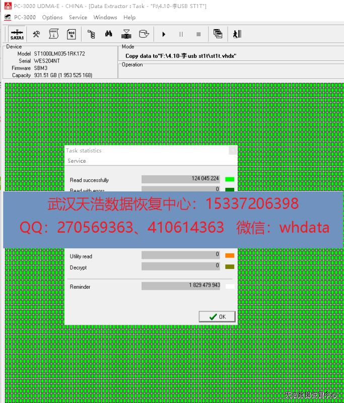 解决方案:收到硬盘后,接到数据恢复工具PC-3000 UDMA Express上,检测发现固件有问题,修复固件后,再通电硬盘认盘,DE分头镜像,成功恢复客户硬盘里面的几乎全部数据!