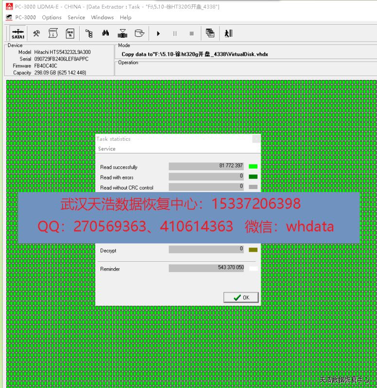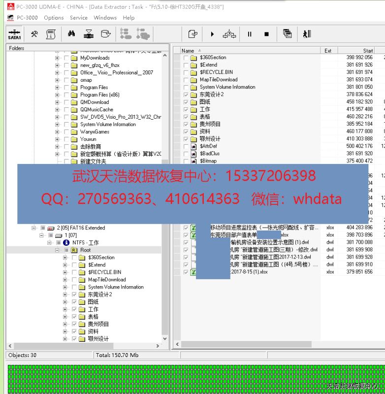 解决方案:收到硬盘后,从我们的备件库找到匹配的备件,在无尘柜里面更换磁头,再接到数据恢复工具PC-3000 UDMA Express上,硬盘认盘,镜像,成功恢复客户硬盘里面的几乎全部工程方面的数据!
