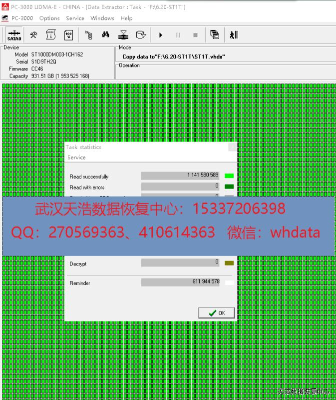 解决方案:收到硬盘后,接到数据恢复工具PC-3000 UDMA Express上,检测发现有一个磁头损坏(此硬盘单碟双头),于是在无尘柜里面更换兼容的磁头,再通电硬盘认盘,DE分头镜像,成功恢复客户硬盘里面的几乎全部数据!