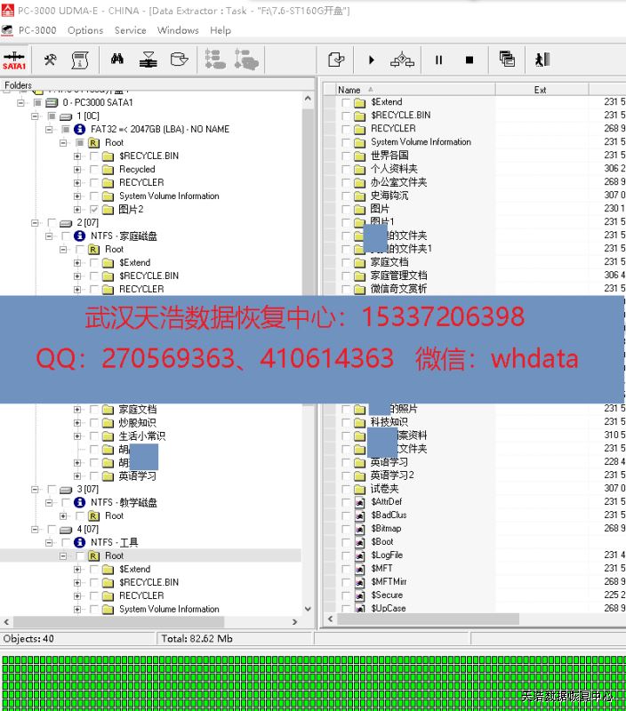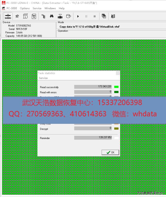 解决方案:收到硬盘后,在无尘环境开盘更换匹配的磁头,接到数据恢复工具PC-3000 UDMA Express上,通电硬盘认盘,DE分头镜像,成功恢复客户硬盘里面的几乎全部数据!