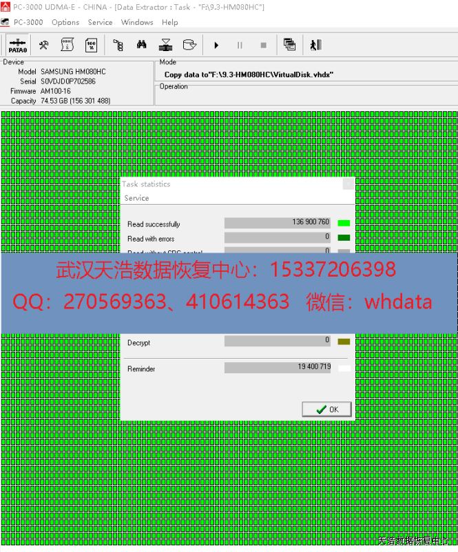 解决方案:这种盘的电路板不含外置ROM芯片,收到硬盘后,我们更换相同的电路板,再接到数据恢复工具PC-3000 UDMA Express上,生成匹配的ROM,断电通电,硬盘正常认盘,DE分头镜像,成功恢复客户的几乎全部数据!