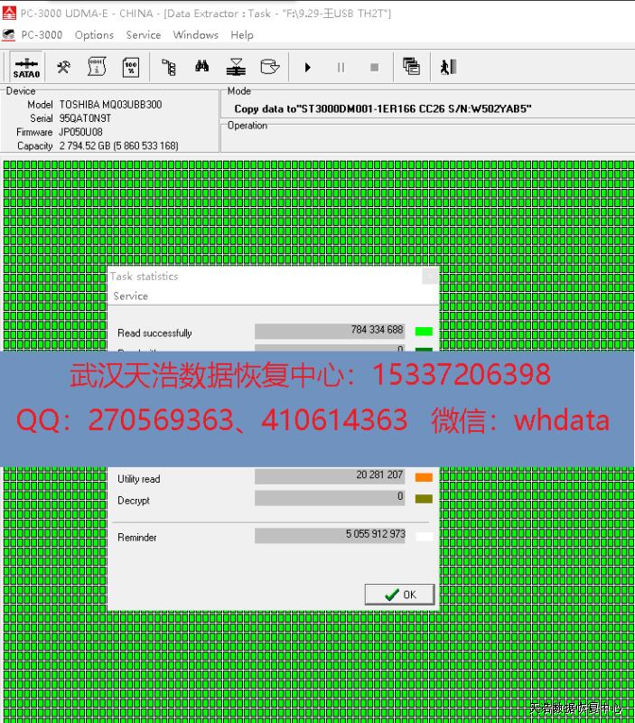 解决方案:收到硬盘后,我们更换兼容的SATA电路板,再接到数据恢复工具PC-3000 UDMA Express上,通电不认盘,处理固件后,硬盘正常认盘,DE镜像,成功恢复客户硬盘里面的绝大部分数据。