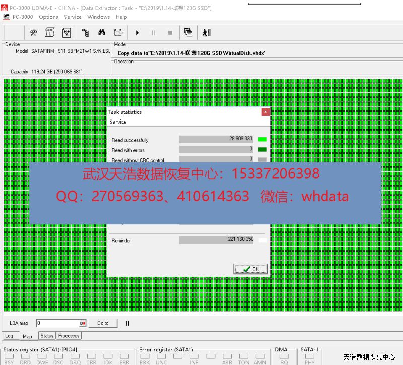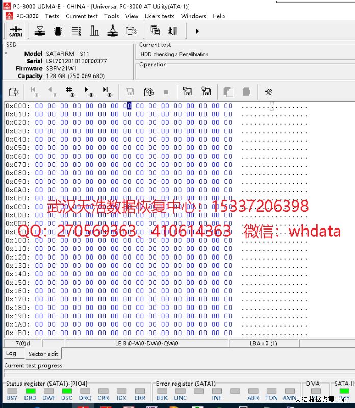 解决方案:收到硬盘后,检测硬盘正常认盘,但型号变成SATAFIRMS11,容量显示正常,但用工具检测发现全盘底层都是00。我们使用专业的SSD恢复工具ACE PC3000 SSD,处理固件问题,虚拟重建编译器,用PC3000 DE虚拟镜像,成功恢复里面客户公司的几乎全部工作资料。