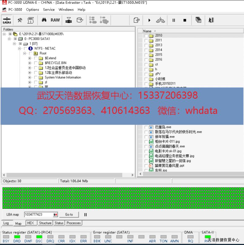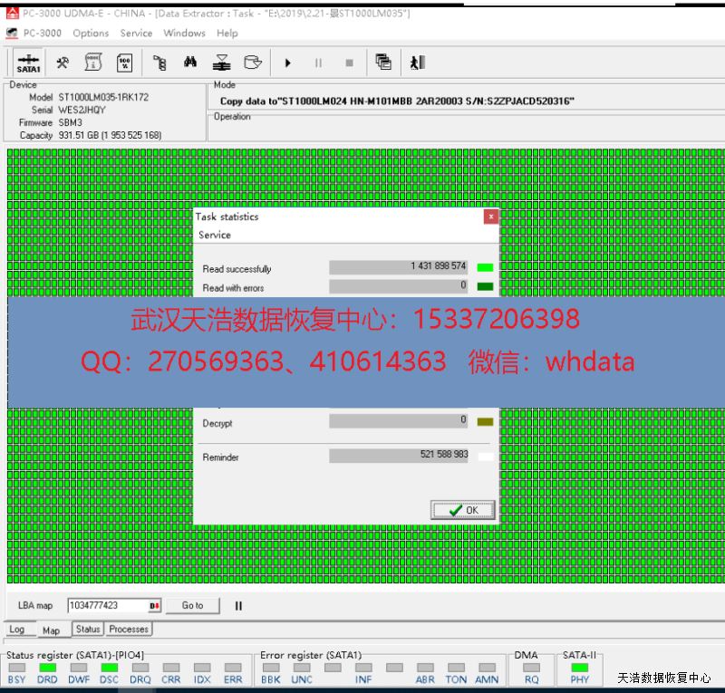 解决方案:收到硬盘后,接到数据恢复工具PC-3000 UDMA Express上,读取ROM,发现盘标SN和读出来的SN不一致,分析ROM,最后成功手工解锁,修复固件,DE分头镜像,成功恢复客户硬盘里面的绝大部分数据!