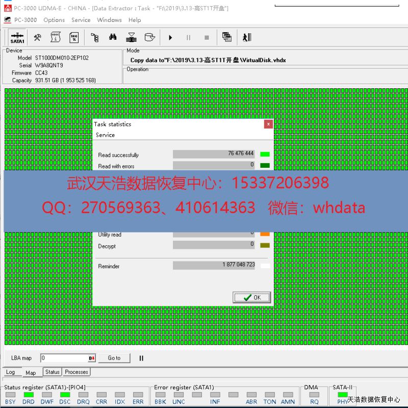 解决方案:收到硬盘后,我们在无尘环境检测,硬盘盘片没有明显划伤,直接更换匹配的磁头,再接到专业数据恢复工具PC3000 UDMA上,硬盘正常认盘,镜像,成功恢复硬盘内的几乎全部数据!
