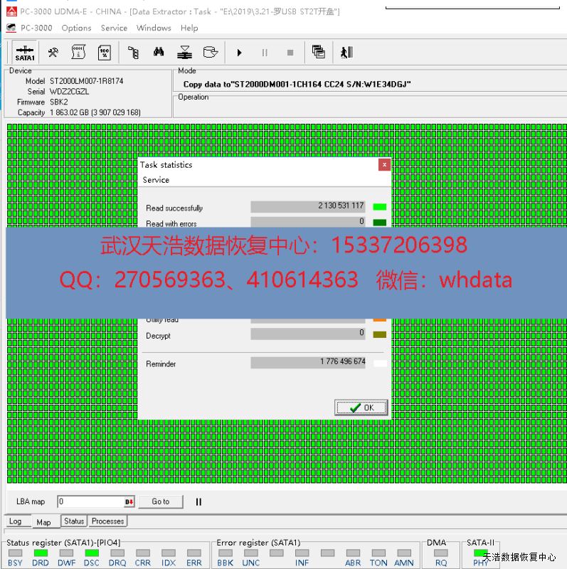 解决方案:收到硬盘后,在无尘环境更换匹配的磁头,接到数据恢复工具PC-3000 UDMA Express上,通电硬盘不认盘,处理固件问题后,硬盘正常认盘,DE分头镜像,成功恢复硬盘里面客户的几乎全部资料,主要是一些手术前后的照片和客户资料。
